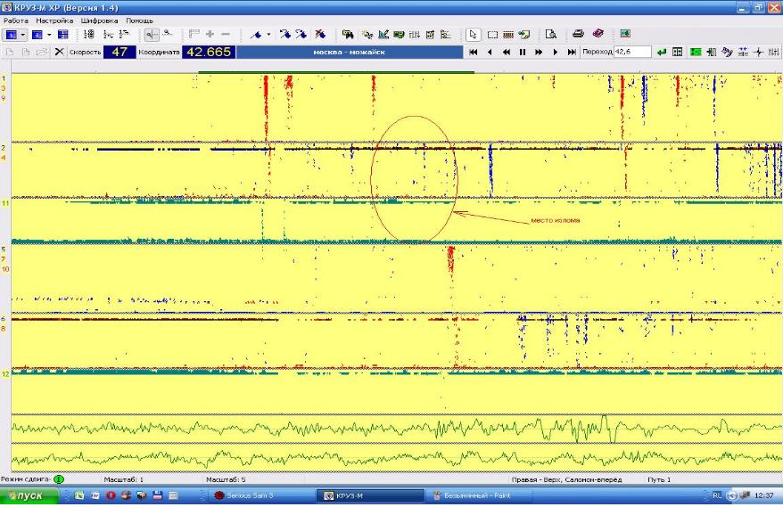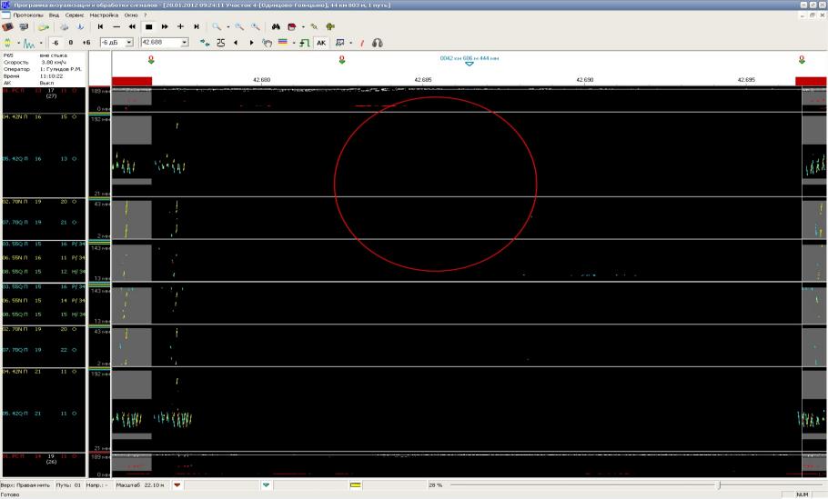 - 03.02.2012 г. производилась проверка съемным дефектоскопом РДМ-2 №1426 оператор Смирнов Л.А. на дефектограмме сигналы от дефекта отсутствуют, отметок на проведение вторичного контроля не выдавалось. После расшифровки дефектограмм (04.02.2012 г.) участок с 848 по 854 км. выдан на перепроверку в 2-х суточный срок по неудовлетворительной записи каналов левой нити.