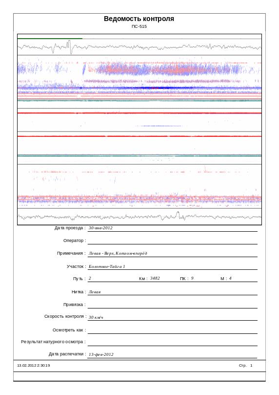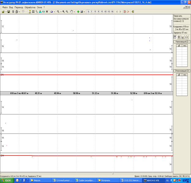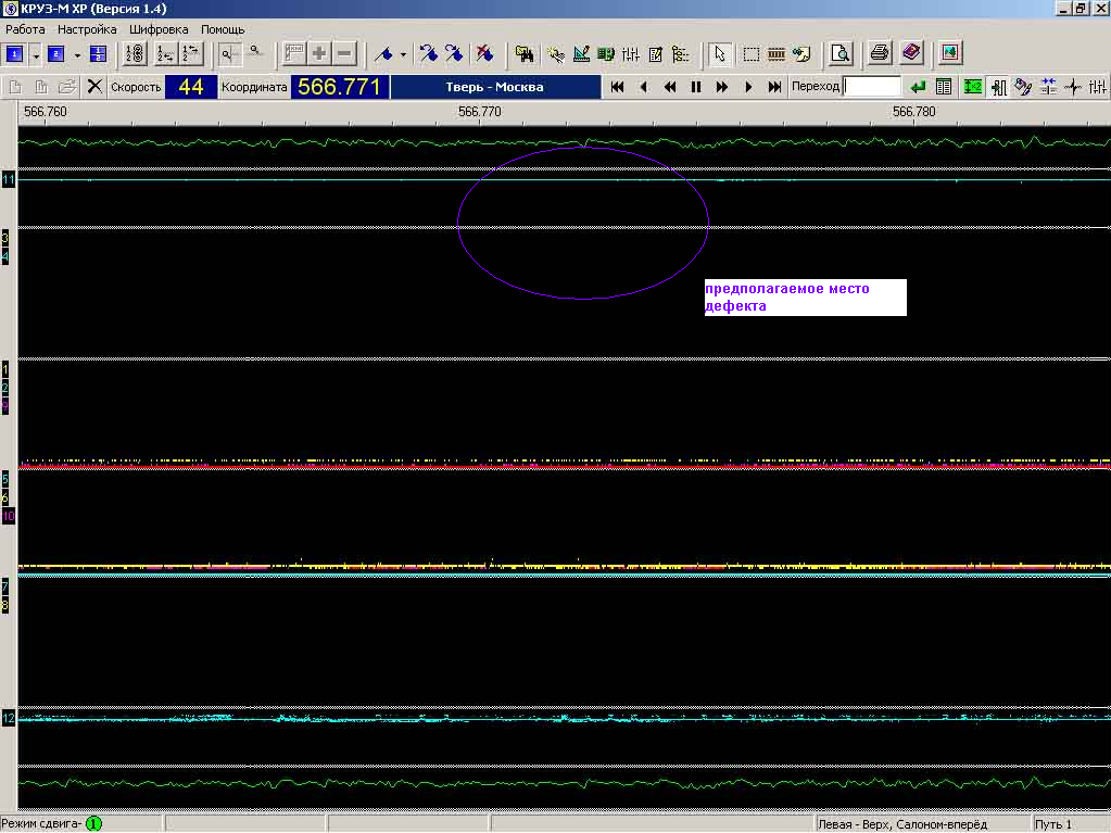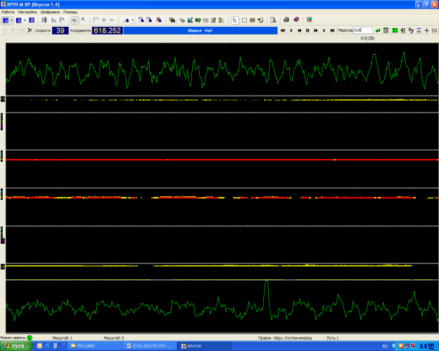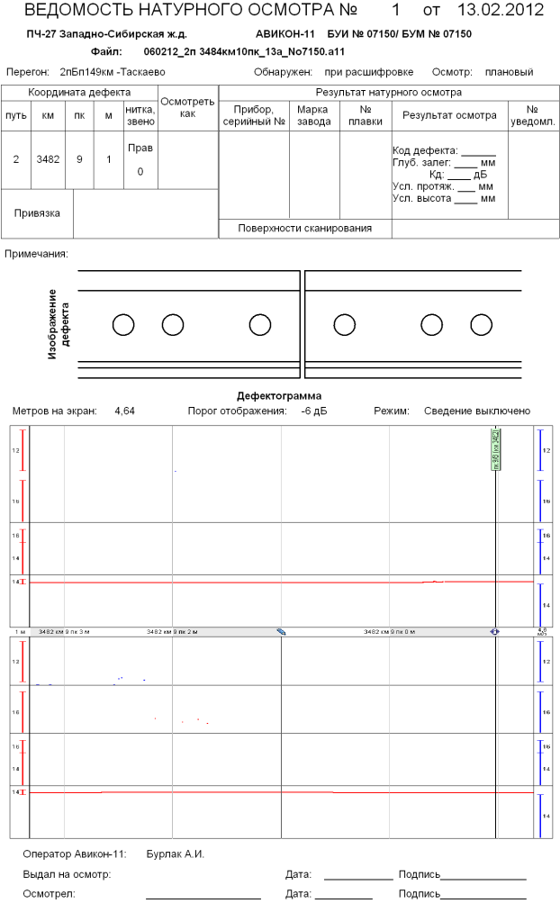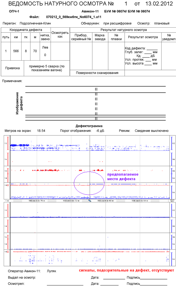 -24.01.2012 г. Авикон-11 № 06074, операторы Лупяк И.А., Матвеев Ю.Н. - дефектов на 566 км пк 8 не обнаружено. Расшифровку производил . инженер – расшифровщик Балашов С.В., - замечаний по расшифровке не выдавалось, условная чувствительность по каналам контроля подошвы и головки рельсов не ниже рекомендованной.