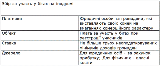 Збір з осіб, що беруть участь у грі на тоталізаторі, на іподромі. Платники - особи, що беруть участь у грі на тоталізаторі, на іподромі. Об'єкт обкладання - плата за участь у грі на тоталізаторі у формі процентної надбавки до плати за участь у грі. Граничний розмір ставки не повинен перевищувати 5% від суми такої надбавки. Облік платників покладений на адміністрацію іподромів. Збір утримується під час придбання квитків на участь у грі й відповідно до строків, що затверджуються місцевими органами самоврядування. Оплата здійснюється за рахунок особистих коштів громадян.