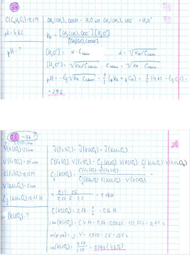 35. К 2,5 мл раствора хлората калия KClO3, прибавили 25 мл 0,1200М раствора сульфата железа (II), избыток которого затем оттитровали 5,00 мл раствора перманганата калия с молярной концентрацией эквивалента 0, 1100 моль/л.; 36. Рассчитать массовую долю KClO3 в растворе, если плотность этого раствора 1,020 г/мл.