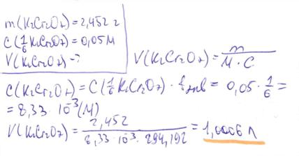 43. В каком объеме раствора содержится 2,452 г калия дихромата, если молярная концентрация эквивалента соли в этом растворе равна 0,05 М?