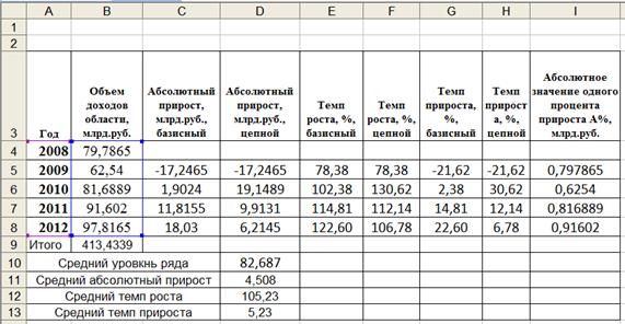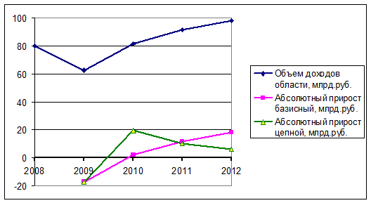 В течение анализируемого пятилетнего периода средний размер объема доходов области составил 82,687 млрд. руб., в среднем за год он увеличивался на 4,508 млрд. руб., или на 5,23 % (Tр=105,23).