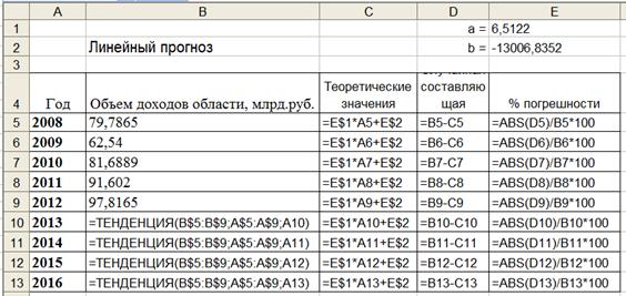 а) Используем функцию ТЕНДЕНЦИЯ (линейное изменение признака)