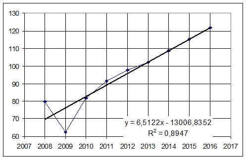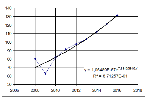 В связи со сказанным выше выбираем экспоненциальную регрессию. Как известно, экспоненциальная регрессия имеет тенденцию ускорения роста.