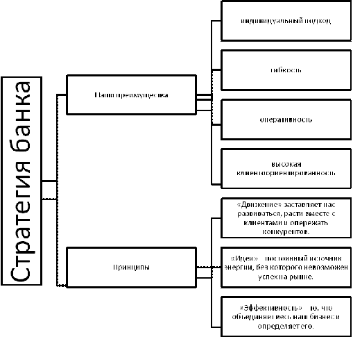 Следовательно, стратегия банка формируется на основе совокупности тех преимуществ, которыми располагает банк, и тех принципов, которые он считает определяющими в своей работе с клиентами.