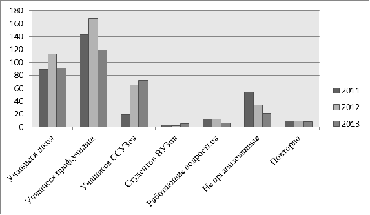 По результатам данной диаграммы мы видим, что различные правонарушения чаще всего совершают ученики школ и училищ. Следствием этого является копирование негативное поведение сверстников.