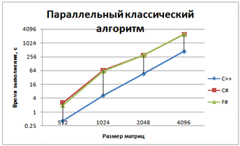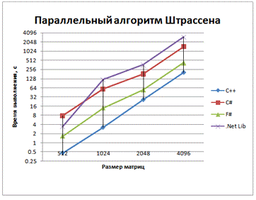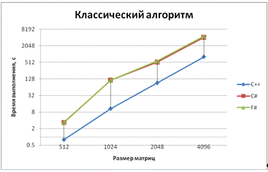 При обычном и обычном параллельном умножениях .NET языки показали одинаковую производительность, чего и следовало ожидать. Здесь и далее С++ намного опережает их по производительности, что доказывает целесообразность использования для приложений, требующих высокой скорости вычислений компилируемых языков, а F# и C# - интерпретируемые языки. .NET совместимые языки компилируются во второй, кроссплатформенный язык, который называется CIL (Common Intermediate Language). А уже зависимая от платформы среда CLR (Common Language Runtime) компилирует CIL в машинный код, который может быть выполнен на данной платформе.