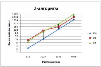 от размера матриц для алгоритма Штрассена с использованием Z-преобразования