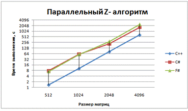 Умножение с использованием Z-преобразования матриц лучше проходит на С#, чем на F#, но значительно хуже распараллеливается (всего 20-25%).