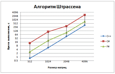 В умножении с использованием метода Штрассена F# показывает лучшие результаты, чем C#. Следует полагать, что это происходит благодаря отходу от императивного способа создания новых матриц и использования связывания имен let.