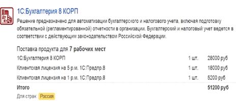 Версия программы "1С: Бухгалтерия 8" КОРП на 7 рабочих мест обошлась бы в 51.200 рублей. [20]