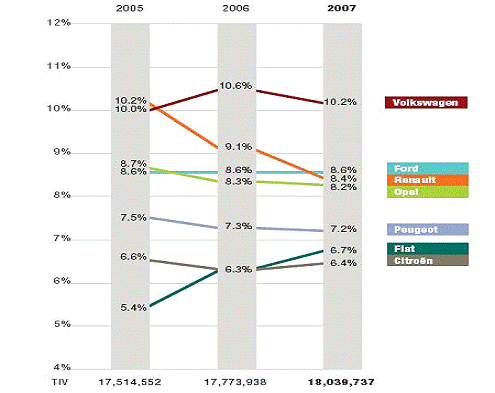 На этом рисунке прекрасно видна динамика конкуренции между компаниями-лидерами. Так падение доли Renault c 10,2% до 8,4% можно объяснить не столь большим, чем ожидалось, спросом на новую Renault Laguna и Modus, и провалом модели Vel Satis в верхнем сегменте авторынка. Зато очень хорошо вырос Fiat, представив модели Punto и Fiat 500 (Cinquecento), которая была особенно тепло встречена публикой. Также немного просел и Opel, который даже после рестайлинга не смог вывести свою модель Vectra в число лидеров. Может быть, ему поможет новая модель Opel Insignia, которая только-только вышла (осень 2013).