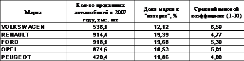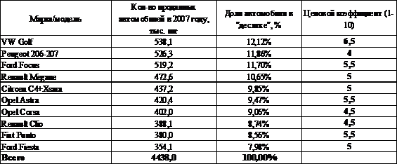 Для анализа конкурентной среды на европейском рынке легковых автомобилей проанализируем десять наиболее продаваемых моделей 2012 года, которые представлены в табл. 1.