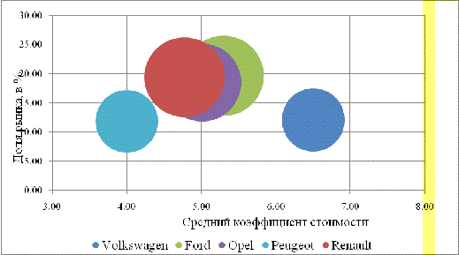 В эту таблицу введен добавочный ценовой коэффициент, который учитывает среднюю стоимость модели на европейском рынке, но представлен в безразмерном виде (1 - самые дешевые китайские модели, 10 - дорогие модели, ограниченные в данном случае Е-классом, так как в высшем классе Renault не представлена.)