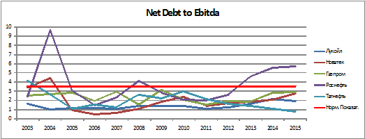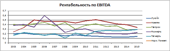У государственных компаний уровень Сurrentratio, выше чем у частных компаний, то есть платежеспособность в краткосрочном периоде у государственных компаний выше, чем у частных. При предыдущем более высоком показателем Leverageу государственных компаний, можно сделать вывод о большем размере долгосрочных заимствований в структуре капитала государственных компаний, по сравнению с частными компаниями. Как и у частных, так и государственных компаний был факт значительного снижения CurrentRatioниже нормативных значений по компании Роснефть в 2004, 2007, 2008 гг и по компании Новатек в 2004, 2010 и 2015 гг. Не смотря на нарушение вышеуказанных компаний нормативных значений, исходя из представленных данных, средние значения показателя за весь период, в том числе, в кризисный период находятся в пределах нормативных значений. EBITDA -показательдолговой нагрузки компании, показывающий ее способность погасить свои обязательства, т.е. данный показатель показывает за сколько периодов при генерации определенных денежных потоков компания сможет расплатиться по своим долгам. Показатель рассчитывается по формуле:
