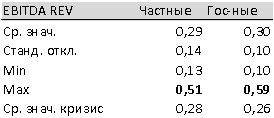 Насколько мы видим, данный показатель является не сильно волатильным как для частных, так и для государственных компаний. Рентабельность по частным компаниям превышает показатель рентабельности по государственным компаниям, как в кризисные так и в некризисные периоды. Таким образом, можно сделать вывод о более эффективном использовании капитала частными компаниями, нежели государственными в части рассчитанного коэффициента. Cредние значения показателя за весь период, в том числе, в кризисный период, по государственным и частным компаниям находятся в пределах нормативных значений. (Sales).Данный показатель показывает рентабельность компании по валовой прибыли, т.е. по EBITDA. Показатель EBITDA показывает прибыль компании до различных выплат, которые могут быть отсрочены по времени, например, налоги, поэтому эти деньги могут быть повторно использованы компанией и за них не надо платить проценты, либо в случае с амортизацией деньги вообще не уходят из компании, что позволяет их использовать в дальнейшем. Рентабельность продаж является индикатором ценовой политики компании и её способности контролировать издержки. Различия в конкурентных стратегиях и продуктовых линейках вызывают значительное разнообразие значений рентабельности продаж в различных компаниях. Данный показатель не имеет нормативных значений и устанавливается каждым кредитором, компанией самостоятельно. Нормативным показателем будем считать показатель равный 0,28 - 0,3 согласно общепринятой бизнес-практике.