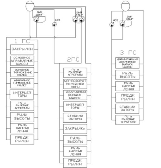 Основной гидросистемы, выполненной в виде трех отдельных систем для повышения надежности полетов: