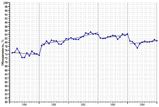 Снижение текущей компенсации способствовало сдерживанию темпов роста обводненности в целом по залежи. Кроме того, ввод новой скважины 163, обводненность которой (20-60 %) значительно ниже, чем по большинству скважин, способствовало снижению обводненности в целом по залежи. Так, среднегодовая обводненность 2014 г. составила 82,7 % (за 2011 г. - 80,7 %, за 2012 г. - 82,2 %, за 2013 г. - 82 %). Учитывая то, что месторождение находится на IV стадии, а на начальном этапе его разработки преждевременный рост обводненности был спровоцирован форсированными отборами, такая динамика обводненности является очень хорошей.