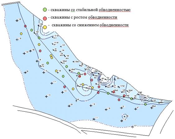 Распределение скважин по динамике обводненности на основе карты обводненности (по состоянию на 01.07.2014 г.) представлено на рисунке 3.2.
