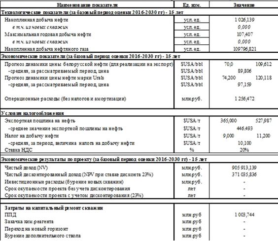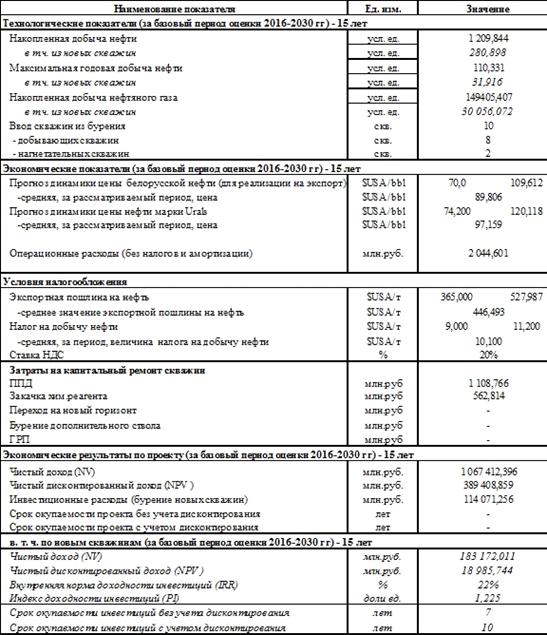 Капитальные вложения предусмотрены бурением 8 добывающих и 2 нагнетательных скважин. Инвестиционные расходы на бурение составят 114071,256 млн. руб. (11.021 млн. $). Чистый дисконтированный доход по новым скважинам при ставке дисконта в 20% составит 18985,744 млн. руб. (1.83 млн. $), внутренняя норма доходности - 22%, а срок окупаемости инвестиций - 10 лет. Планируется проведение мероприятий по ПНП с легкофильтрующимся материалом. Чувствительность варианта разработки за базовый период оценки 2016-2030 гг. к изменению параметров внешней среды можно охарактеризовать как низкую, в пределах +/-20% коридора изменения (от базовых) значимых параметров проект устойчив, а чистый дисконтированный денежный доход в целом по проекту положителен. При понижении прогнозируемой цены нефти на 20% (до 56 $usa/bbl) от заложенной базовой цены (70 $usa/bbl), чистый дисконтированный доход проекта в базовом периоде оценки (2016-2030 гг) составляет 345605.763 млн. руб. (33.39 млн. $)