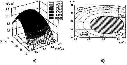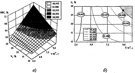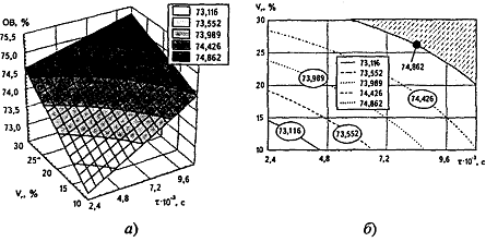 в барабане (Vr,%): а) поверхность отклика; б) изолинии ее сечений