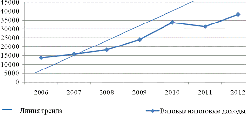На графике отражены налоговые доходы, фактически поступившие в бюджет края до 2012 года и планируемый объем налоговых поступлений в 2013 году исходя из принятого бюджета. Согласно рисунку тенденция роста налоговых поступлений сохранится и в 2013 году. Если сравнить линии тренда полученные двумя рассмотренными способами, то видно, что линия тренда налоговых доходов круче линии тренда построенной на показателях экономической активности. Это свидетельствует о более стремительном росте налоговых поступлений, чем экономических показателей, обусловленных в основном ростом доходов населения и прибыли организаций. Таким образом, рост налоговых доходов в 2013 году достигнет отметки в 40000 млн. руб., что в 2,5 раза меньше, чем в первом варианте. Заметим, что этот рост обусловлен исключительно налоговыми доходами.