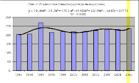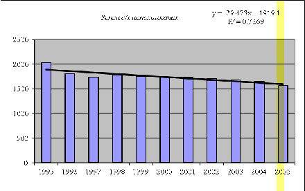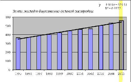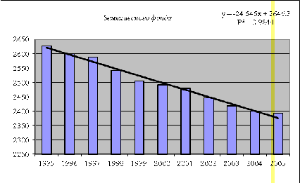 Вывод: методом экстраполяции можно сделать прогноз по землям всех видов использования. Прогноз осуществлялся на 10 лет, в ходе прогноза было определено, что по отношению к 2005 г. на перспективу: