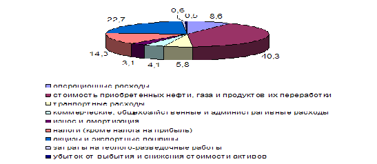 Данная диаграмма показывает, что набольшая доля затрат приходится на стоимость приобретенных нефти, газа и продуктов их переработки (40,3%), а также акцизы и транспортные пошлины (22,7%).