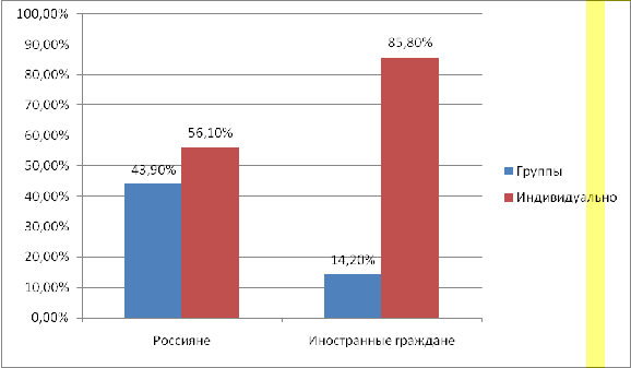 Тот факт, что среди иностранных клиентов большую часть составляют индивидуальные посетители объясняется тем, что иностранцы, как правило, приезжают в Челябинск на деловые переговоры индивидуально, а не в группах.