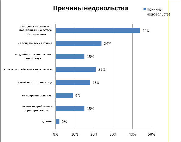 Далее, на рисунке 7 рассмотрим причины, на которые указали клиенты, которые остались недовольными услугами гостиницы.