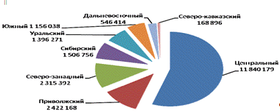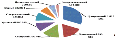 Рассматривая территориальную структуру выдачи заемных средств юридическим лицам и ИП (рис. 2) видно, что более половины (55%) кредитов в стране выдается в Центральном федеральном округе, из которых 88.2% приходятся на г. Москва и Московскую область. Таким образом, практически каждый второй рубль, выдаваемый коммерческими банками на современном этапе, приходится на столицу, что говорит о низкой дифференциации финансовых потоков и деловой активности в стране: они сосредоточены в одном месте - в Москве.