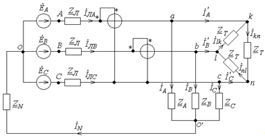 В полученной схеме вследствие ее симметрии нейтральные точки генератора и