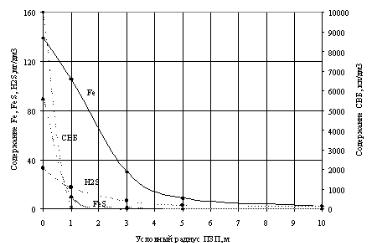 Осредненные результаты измерений представлены на рисунке 1, из которого следует, что сульфид железа в твердой фазе присутствует в больших количествах непосредственно в стволе скважины и в призабойной зоне пласта радиусом 1 метр. Наибольшая концентрация ионов двух- и трехвалентного железа наблюдается в скважине и в ПЗП на удалении до 5-ти метров. Колонии СВБ и выделяющийся в результате их жизнедеятельности сероводород концентрируются в самой скважине и в призабойной зоне пласта радиусом 1-3 метра.