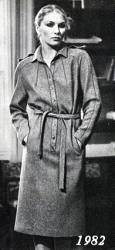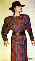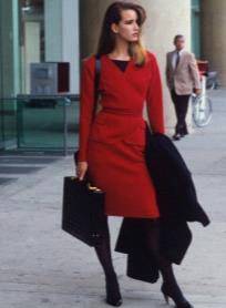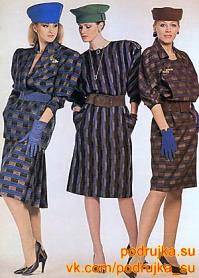 «Деловая женщина» 80-х одевалась в соответствии с весьма своеобразным дресс-кодом: обязательная мини-юбка и широкий, просторный пиджак в стиле «клубного блайзера», зачастую двубортный, с очень широкими плечами и английским воротником (Рис.1). Дополняли эту юбку в офисе, как правило, яркий макияж и массивные «золотые» клипсы. Кроме того, деловой стиль 1980-х вспомнил о костюмах «шанель» - строгих, с прямым пиджаком, без воротника, зачастую отделанный кантом. Как правило, дополнялось это простой футболкой или дорогой шелковой блузкой, и статусной сумкой (зачастую поддельной) [4].