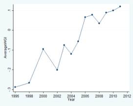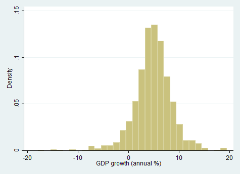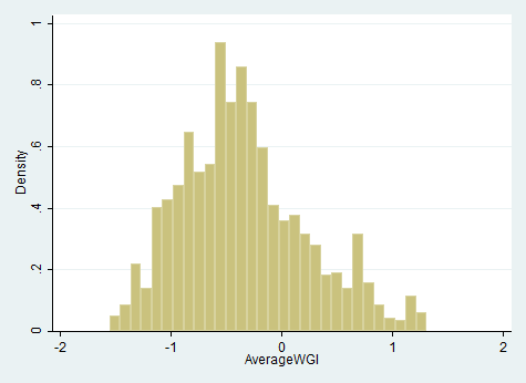 Начнем с показателей качества институтов. Данные индексы рассчитываются их собственной методологии Всемирным Банком начиная с 1996 года по настоящие дни. Индексы рассчитываются для более чем 200 государств, а в качестве источников данных используются около 40 различных исследовательских групп, сотрудничающих с Всемирным Банком. Каждый из 6 показателей принимает значения приблизительно от -2.5 до 2.5 (при этом -2.5 является наихудшим показателем качества институтов и, соответственно 2.5 - наилучшим) и имеет распределение, близкое к стандартному нормальному (что является очень удобным для построения моделей, где данные по переменным должны иметь нормальное распределение в качестве допущения). В данной работе данные шесть индексов объединяются в один общий показатель, характеризующий средний уровень качества институтов по всем аспектам. Для рационализации использования модели регрессии с фиксированными эффектами необходима нормальность распределения исходных данных по ключевым переменным. Учитывая что мы рассматриваем лишь развивающиеся страны данное допущение о нормальности в нашей выборке необходимо проверить.