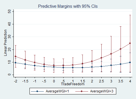 ) Политики, связанные с улучшением качества институтов позволяют избежать нивелирование эффекта либерализации торговли. В нашей модели регрессии данный аспект операционализируется с помощью включения переменной качества институтов в качестве переменной-модератора, взаимодействующей с переменной свободы торговли. При этом совокупный эффект взаимодействия двух переменных и квадратичности одной из них имеет линейную с зависимой переменной (это позволяет нам пользоваться регрессионными моделями для выявления зависимостей).