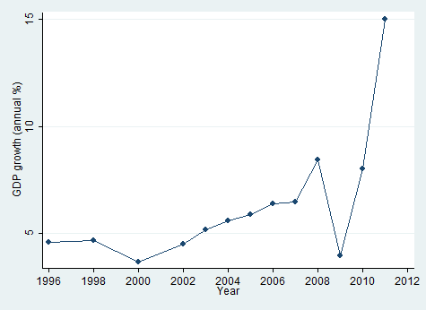 Рассмотрим как менялись темпы роста ВВП в Гане в период с 1996 по 2012 годы.