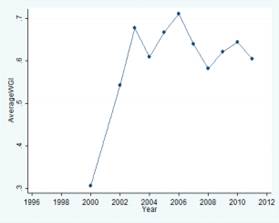 Как мы можем видеть, за указанный промежуток времени до 2008 года. (Что касается времени сразу после 2008 года, то ее сложно интерпретировать с точки зрения построенной модели, потому что велико влияние экономического кризиса 2008 года на показатели темпов роста ВВП. Иными словами данный период имеет большое количество статистических выбросов, интерпретация которых в рамках модели затруднительна. Подобное положение дел сохраняется и для многих других государств.) Мы наблюдаем также постепенной повышение как показателя свободы торговли, так и показателя среднего уровня качества институтов. Иными словами подтверждается та же зависимость между графиками для случая Литвы, что была продемонстрирована на примере с Республикой Гана.