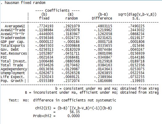 При этом применялась модель множественной регрессии с фиксированными эффектами, а также с использованием квадратичного эффекта и эффекта взаимодействия некоторых переменных. Значимость коэффициента при переменной, отвечающей как за взаимодействие, так и за квадратичность позволяет нам судить о необходимости улучшения качества институтов в развивающихся странах совместно с политикой либерализации торговли, чтобы нивелировать постепенное уменьшение отдачи от последствий этой политики на темпы экономического роста развивающихся стран.