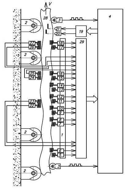 1 - рельс; 2 - рольганг; 3, 4, 5, 6, 7 - измерительные датчики; 4’ 5’ 6’ - следящие датчики; 8, 9 - преобразователи выходных сигналов датчиков 3’ 7;10 - усилители; 11, 12, 13 - разностные блоки; 14, 15 - реверсивные электродвигатели; 16, 17, 18 - регистраторы; 19 - линейка - копир; 20, 21 - индуктивные катушки.