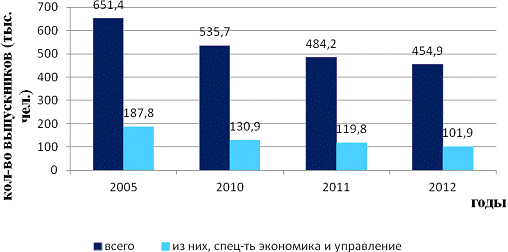 Итак, мы видим, что количество выпускников по специальности и направлению «экономика и управление» как высшего, так и среднего профессионального образования к 2012 году снизилось. Тем не менее, на основании анализа вышеприведенных данных, можно сделать вывод том, что выпуск специалистов экономических специальностей занимает лидирующие позиции в сфере образования.
