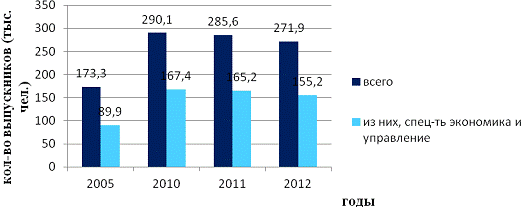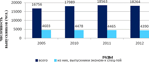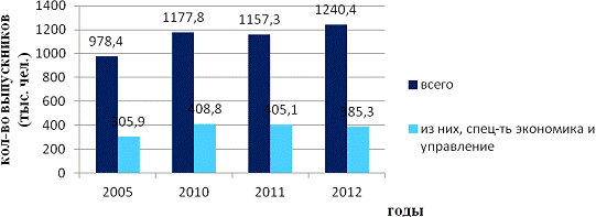 Таким образом, за прошедшие семь лет, выпуск специалистов с высшим профессиональным образованием государственными и муниципальными образовательными учреждениями, по отношению к предыдущему году, в 2010 - увеличился на 20,38 %, в 2011 - уменьшился на 1,74 %, в 2012 - увеличился на 7,18 %. Из общей численности выпускников, количество выпускников экономических специальностей составило: 2005 г. - 31,27%, 2010 г. - 34,71 %, 2011 г. - 35,00 %, 2012 г. - 31,06 %. Мы видим, что процент выпускников экономических специальностей, по отношению к предыдущему году, от общего числа выпускников, в 2010 г. увеличился на 3,44 %, в 2011 г. увеличился на 0,29 %, а к 2012 г. снизился на 3,94 %. Несмотря на то, что процент выпускников экономических специальностей, к 2012 году, снизился, потребность в экономистах, в общем, не уменьшилась.