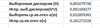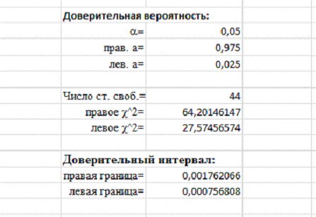 Получили, что дисперсия выборки находится в интервале от 0,000756808 до 0,001762066.