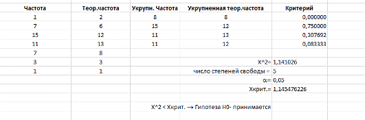 Произведя все действия по данному алгоритму, получаем для выборки по курсу рубля значения ????2 = 1,141 и ????крит. (0,05;6) = 1,145 (Рисунок 20). Это говорит о том, что гипотеза о нормальном распределении принимается с ошибкой 0,05.