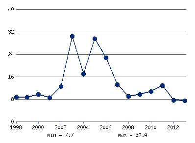 На рисунке 1.6 можно заметить, что промышленное производство Китая на самом высоком уровне находилась в период с 2002 по 2006 годы, далее производство вновь начало снижаться к 2013 году, и на данный момент времени находится примерно на том же самом уровне, что и в 1998 - 2001 годах.