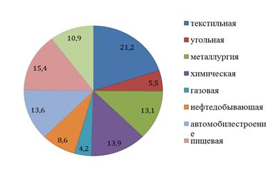 По данным диаграммы можно сделать вывод, что наибольшую долю промышленности (21,2%) занимает текстильная отрасль. Также ведущими отраслями промышленности Китая являются пищевая (15,4%), химическая (13,9%) отрасли, автомобилестроение (13,6%), металлургия (13,1%) и другие.