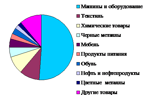 Самую большую долю экспорта Китая занимают машины и оборудование. Она составляет 51%, то есть больше половины экспорта. В КНР хорошо развита текстильная промышленность. Она составляет 10% всего совокупного экспорта. Кроме того, из страны вывозится большой объем химических товаров и изделий из пластмассы, черные металлы, мебель, продукты питания, обувь. Меньшую часть экспорта занимают нефть, нефтепродукты, цветные металлы и другие товары.