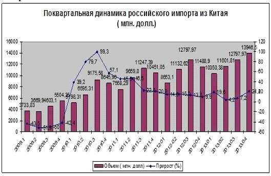 Анализ развития внешней торговли Китая и России за прошедшие 5 лет (2008-2012 гг.) свидетельствует о том, что среднегодовые темпы прироста внешнеторговых объемов составили 16,64%, что на 3,18 процентных пункта выше, чем среднегодовые темпы прироста совокупного объема внешней торговли Китая (+13,46%). При этом среднегодовые темпы прироста экспорта Китая в Россию составили 16,44%, что на 4,28% выше, чем темпы прироста совокупного экспорта Китая (+12,16%).