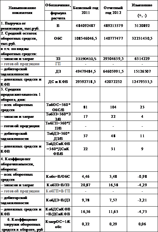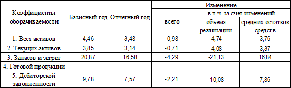 Коэффициент оборачиваемости показывает число оборотов, совершаемых оборотными средствами за отчетный период. В отчетном периоде количество оборотов по всем видам оборотных средств уменьшилось. Это явилось следствием увеличения средних остатков оборотных средств.