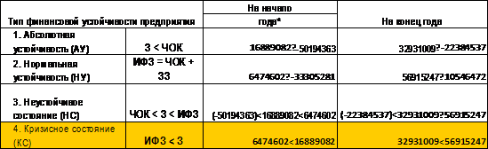 Финансовая устойчивость предприятия достигается при таком состоянии финансовых ресурсов, которое обеспечивает развитие предприятия на основе роста прибыли и капитала при сохранении платежеспособности и кредитоспособности в условиях допустимого уровня риска. Степень устойчивости состояния предприятия условно разделяется на 4 типа (уровня).